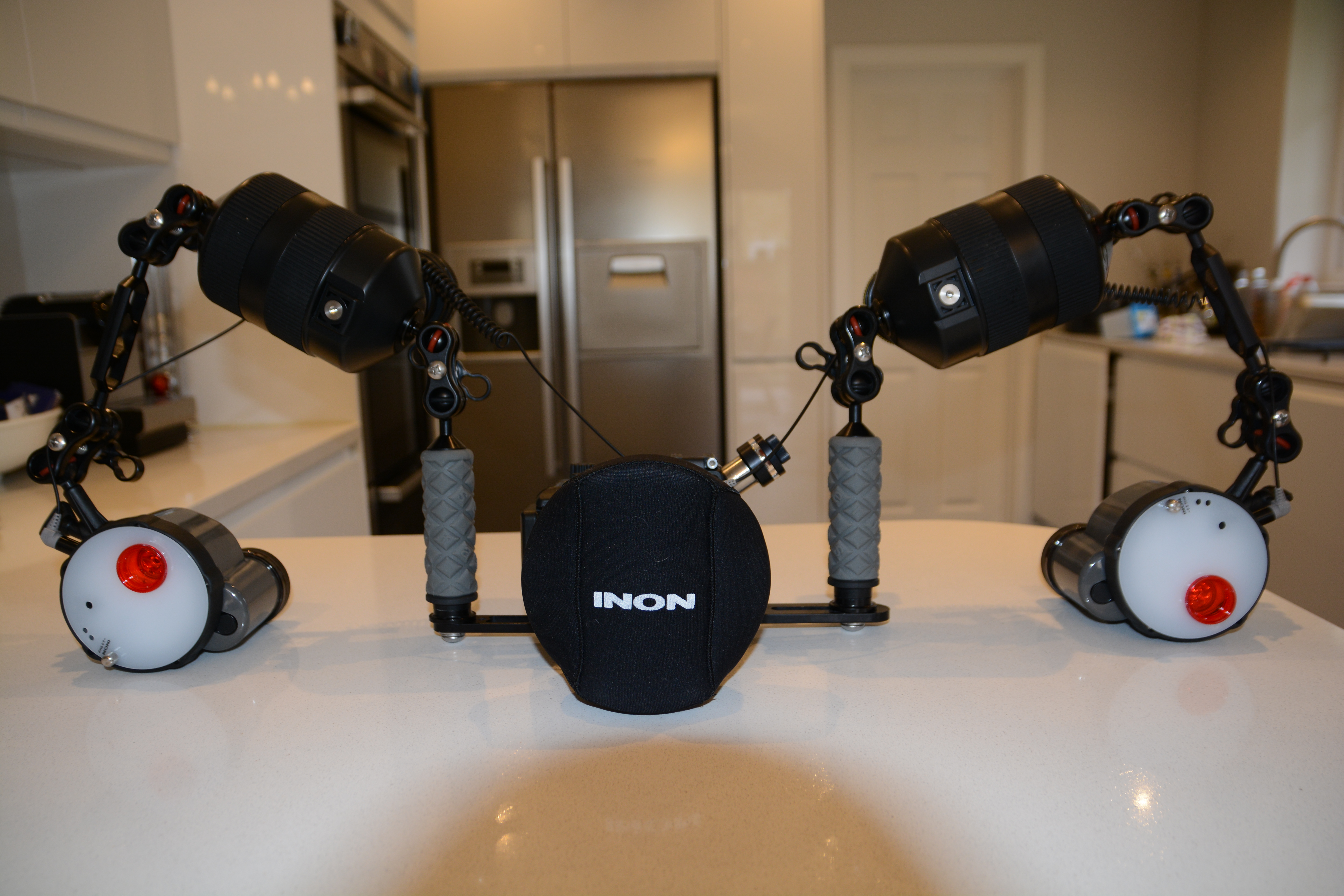 I use locline arms for video and this greatly helps reducing weight both in and outside water. My compact video rig is around 500 grams or 1.1 lbs in water but also very lights outside water. The Sola lights really help with their incredibly compact size. The heaviest items are the tray and handle and the lenses.