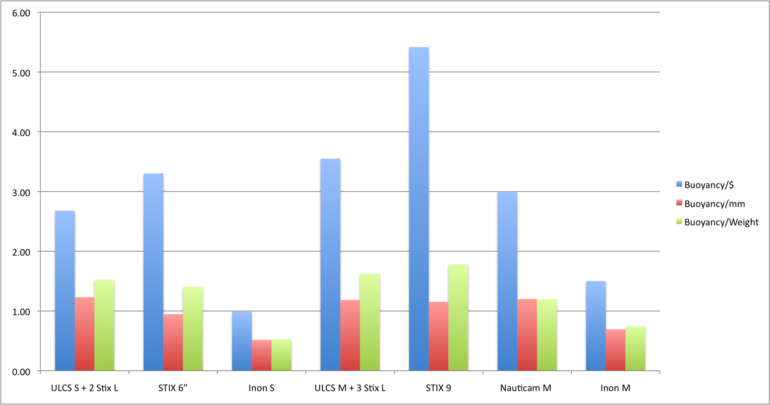 Stix float arms score higher on a Buoyancy/$ metric and also lead the way in terms of buoyancy/weight ratio however the amount of lift offered is limited and this solution does score low on the buoyancy/mm metric. Especially in the medium segment around 8/9 inches you can see that there is not much difference on a buoyancy/$ between a 9″ stix arm and an Inon M mega.