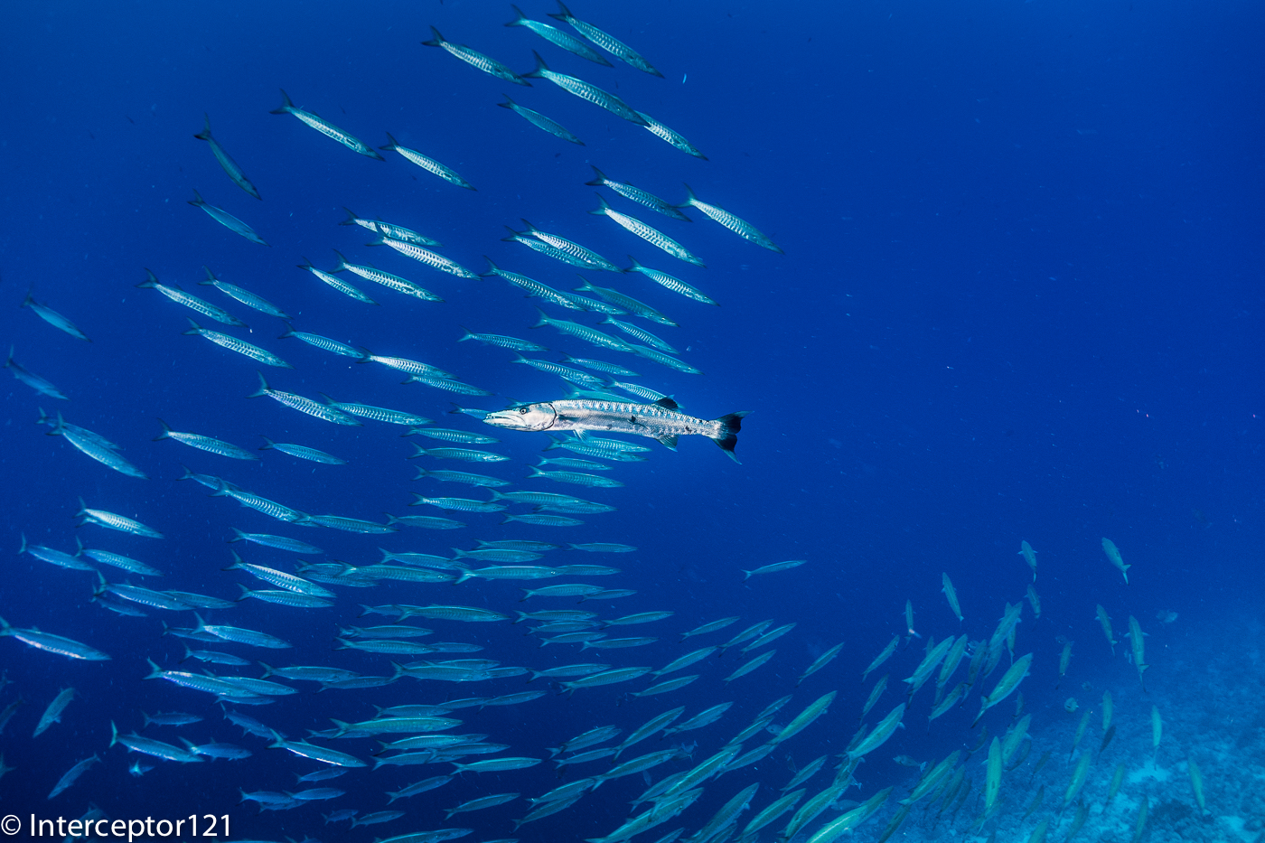 On the second dive I was lucky to spend some time with a Giant Barracuda that was literally commanding the school at sight, very rewarding from a diving point of view I got so excited that I kept shooting with a relatively slow shutter speed however the fish that is lit by the strobe is well crisp.
