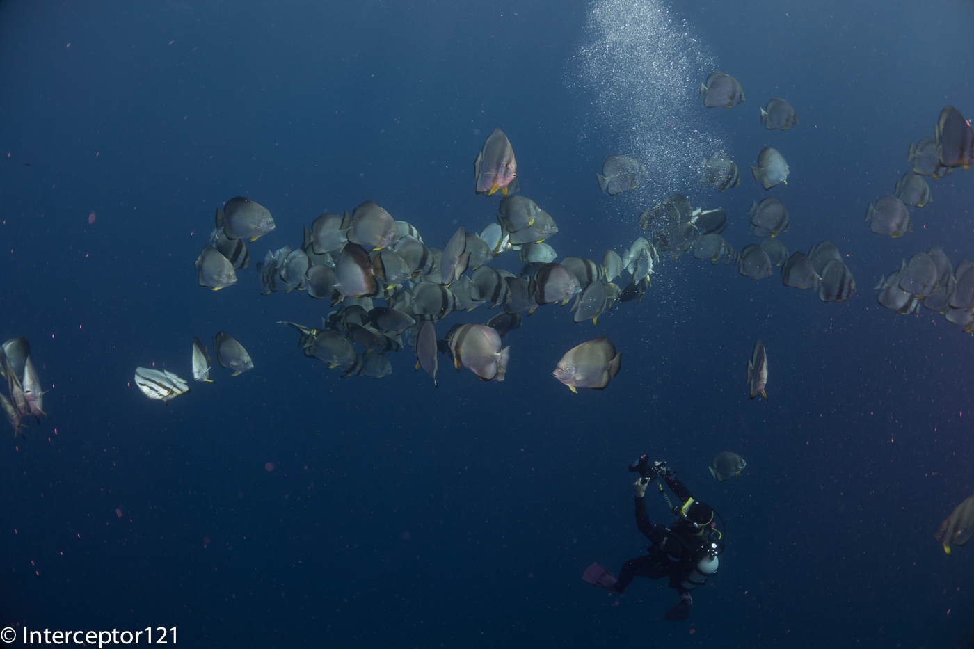 It was time to give it a proper go. To be honest is not that I like batfish that much and probably this is one fish that you can shoot in RAW in ambient light however if you do that you need to sacrifice quite a few ISO stops. With strobes the issue is to get the school in a formation that allows you to do a good job with lighting. This is my best shot for the session.