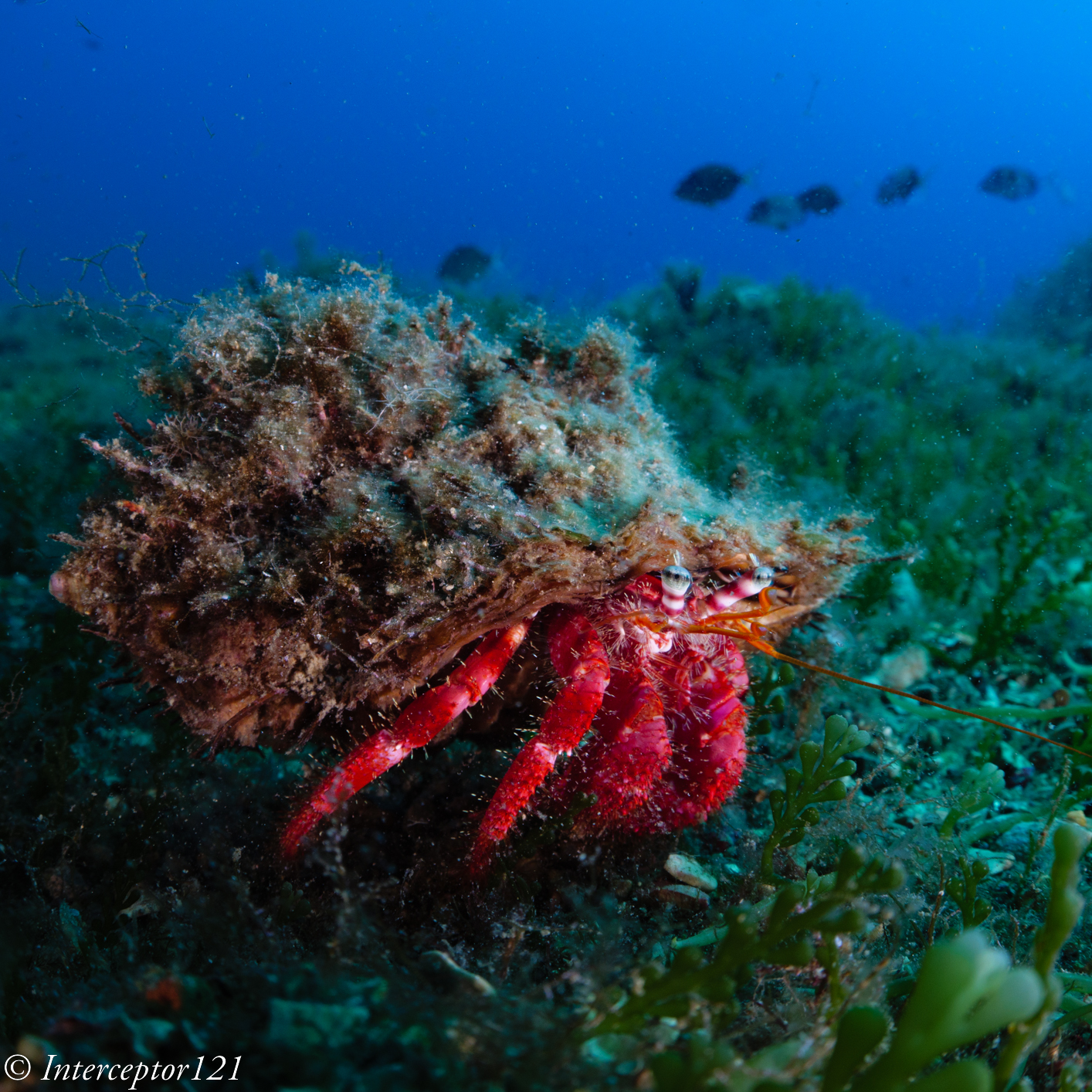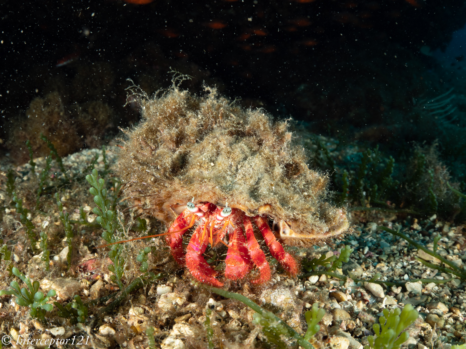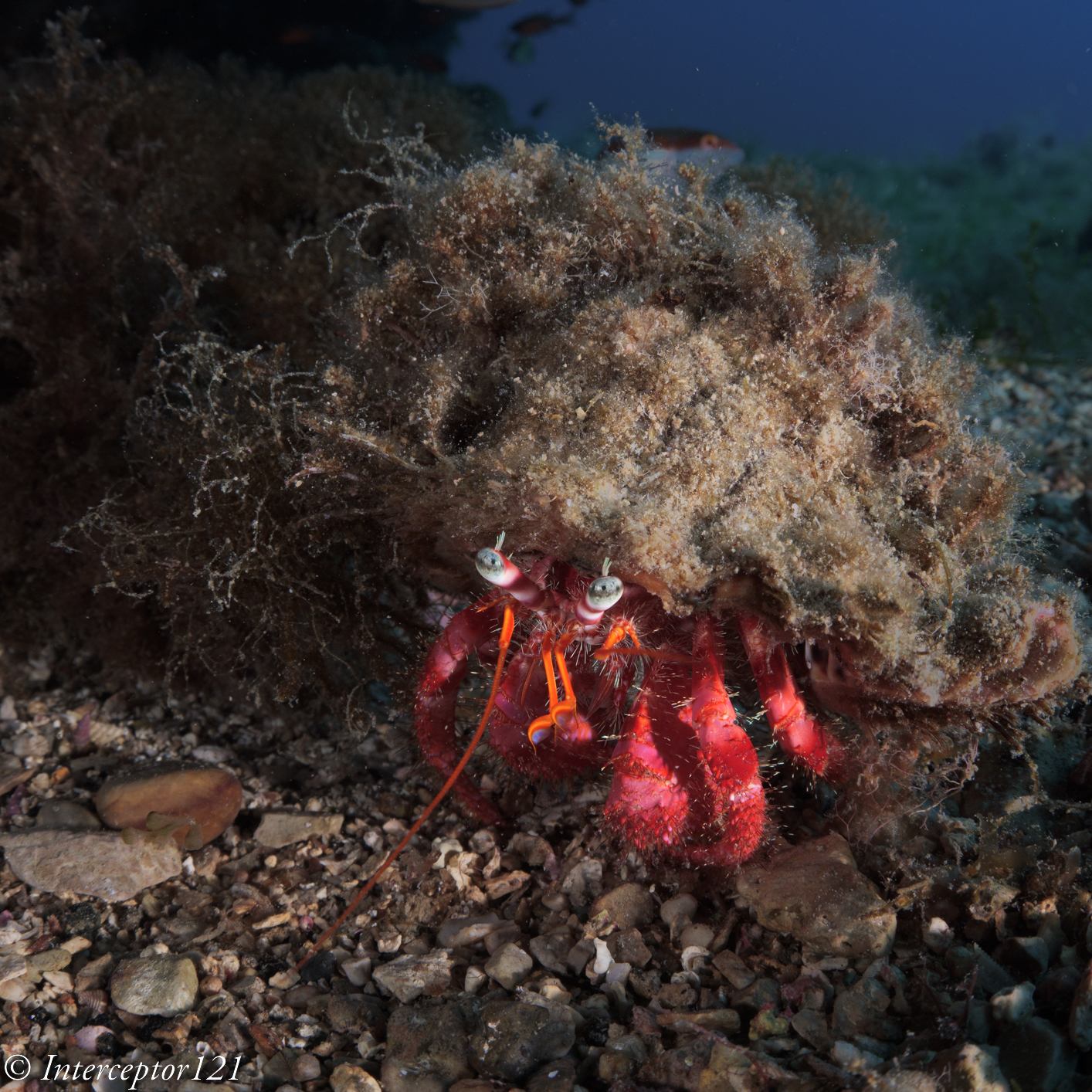 A few days later I am on another dive site shooting wide angle again and I notice a large hermit crab on the seafloor. I try a crossed strobe shot and with my horror I notice many large particles backscattering over the black background.