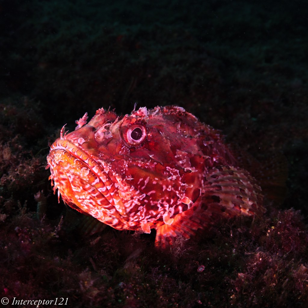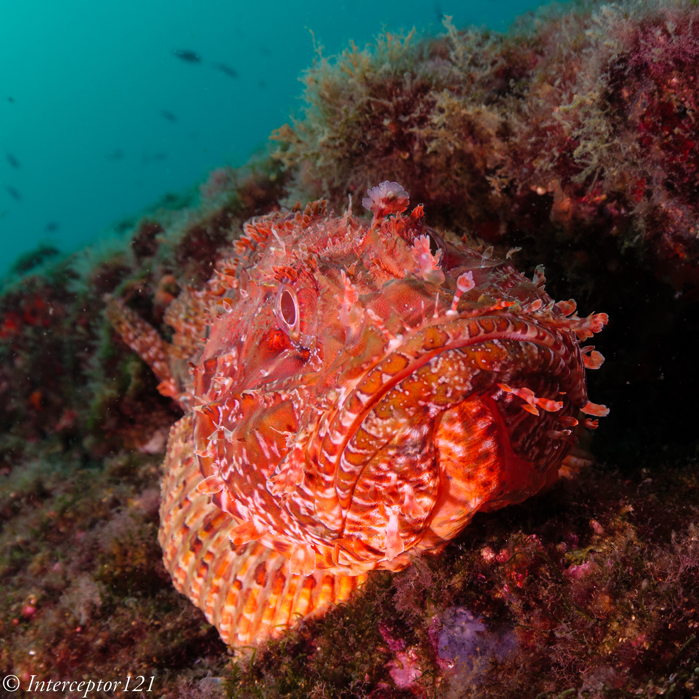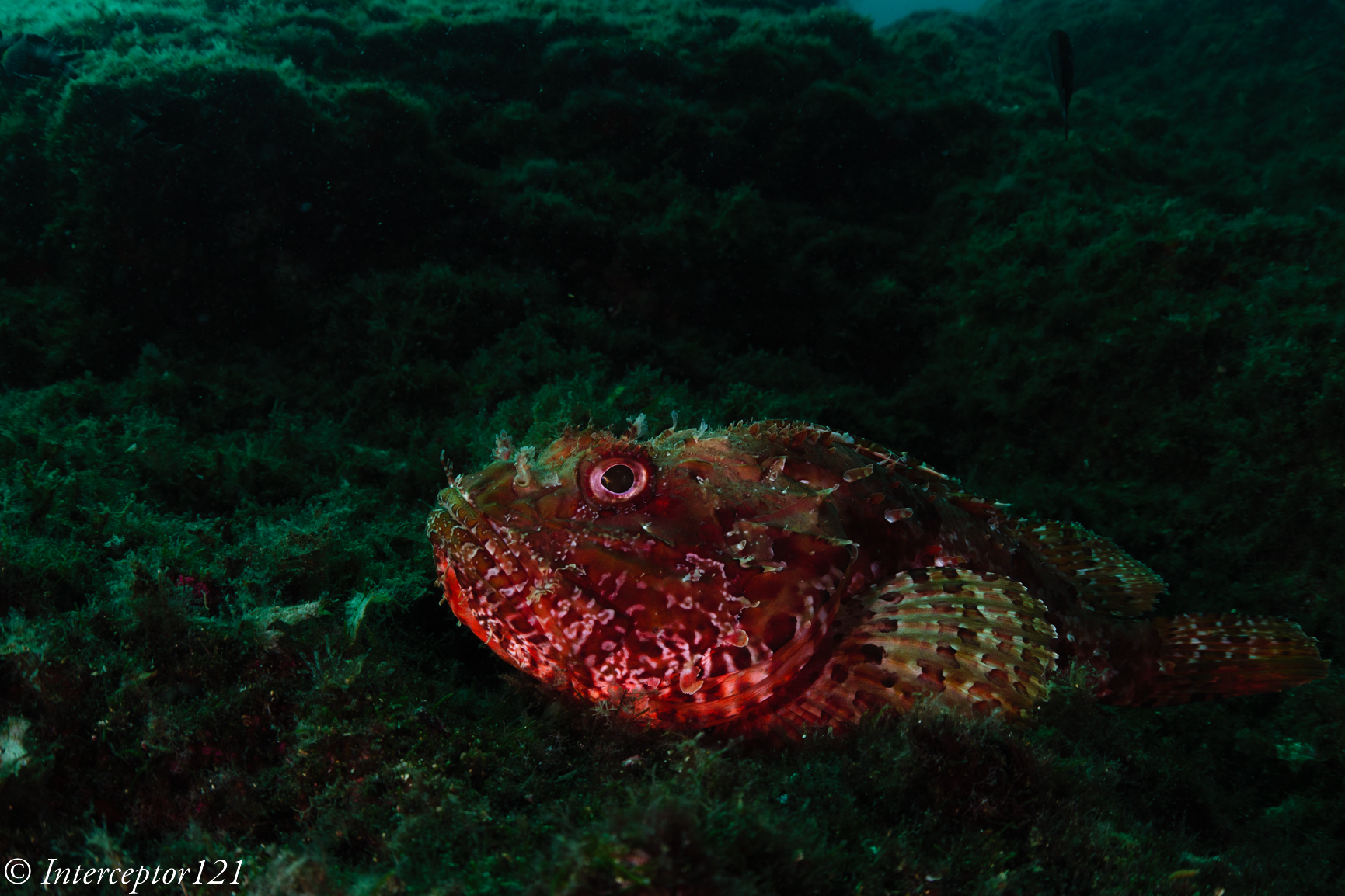 During this summer I had the opportunity to visit the Sorrento Peninsula again and dive with the friends at Punta Campanella Diving Centre. On day one of diving, the plan was to visit the dive site called Banco di Santa Croce, a group of offshore pinnacles ranging from 12 to 50 meters depth where there is abundance of groupers, rockfish, anthias occasional eagle rays and plenty of gorgonians. Usually, the visibility is terrible in the first meters and then clears up after the thermocline around 15 meters, however, on the day the visibility was pretty bad until around 30 meters. After a set of pretty deep gorgonian shots and seeing that the groupers were very un-cooperative, I went above the thermocline on the shallower pinnacle to see what I could shoot. Visibility was pretty bad with murky green water and a high number of suspended particles and I had an 8-15mm zoom fisheye on my Panasonic GH5M2 (similar to a Tokina lens on APSC). All of a sudden, I see a large “scorfano” (rockfish a variety of scorpion fish) swimming over the reef to change its resting location.
