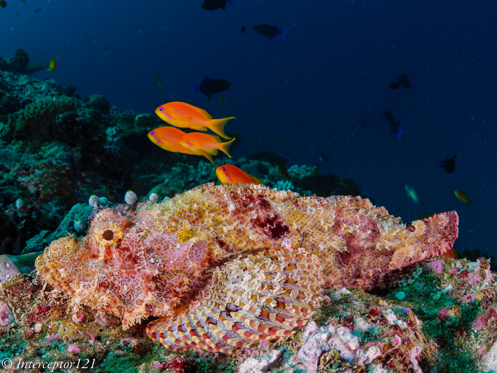 I change the strobe position for inward lighting wide angle and place myself so I would get some blue water in the background that would reduce the contrast of the particles.