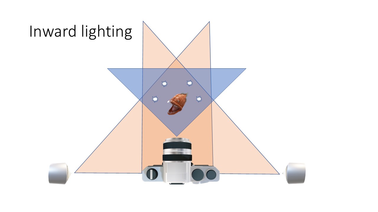 From the diagram you can see that the area where the lens and the strobes beams overlap can generate backscatter. As the strobes are aligned with the lens the phenomena can be really strong, as demonstrated in the first hermit crab shot.