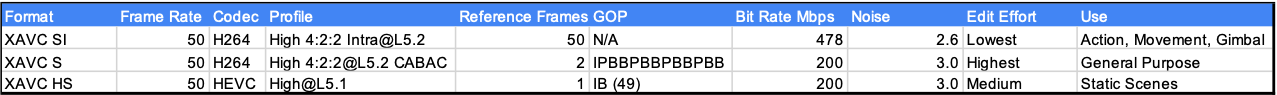 The S variation is good in terms of space saving as well as generally being effective for motion however it is the hardest one to edit. If space is a problem and you are happy to convert or edit natively XAVC S is a good option. If you need something that can go on for long and manages almost all situations the XAVC S should be your choice however unless you have a workstation that supports accelerated H264 10 bits 422 (and there are not many at all) you will need to convert to an intermediate codec spending more time in post processing.