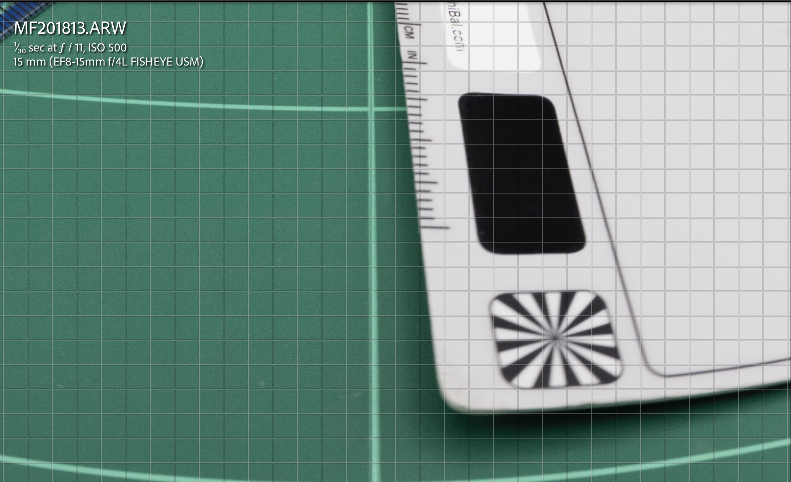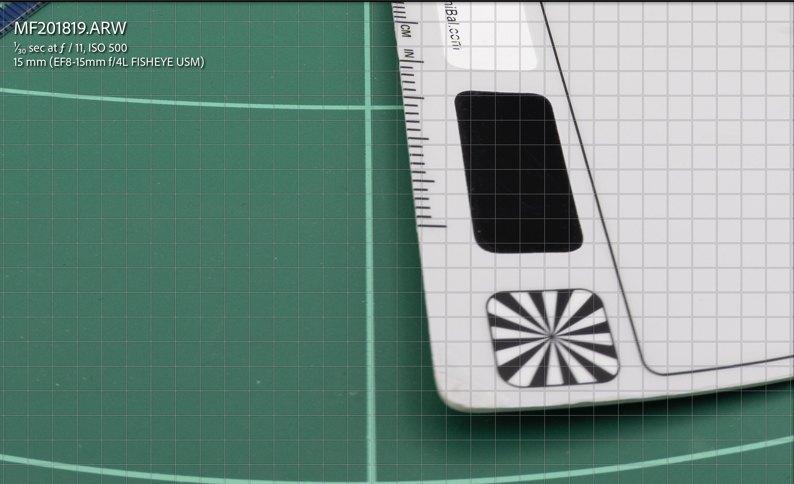 This is the same target at the same distance with the Canon 8-15mm at f/5.6 note how the edges are blurry and the blur starts very near centre.