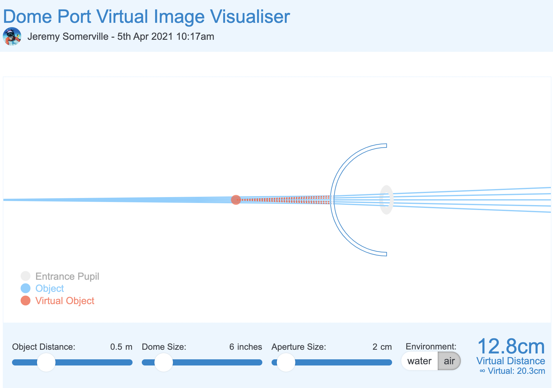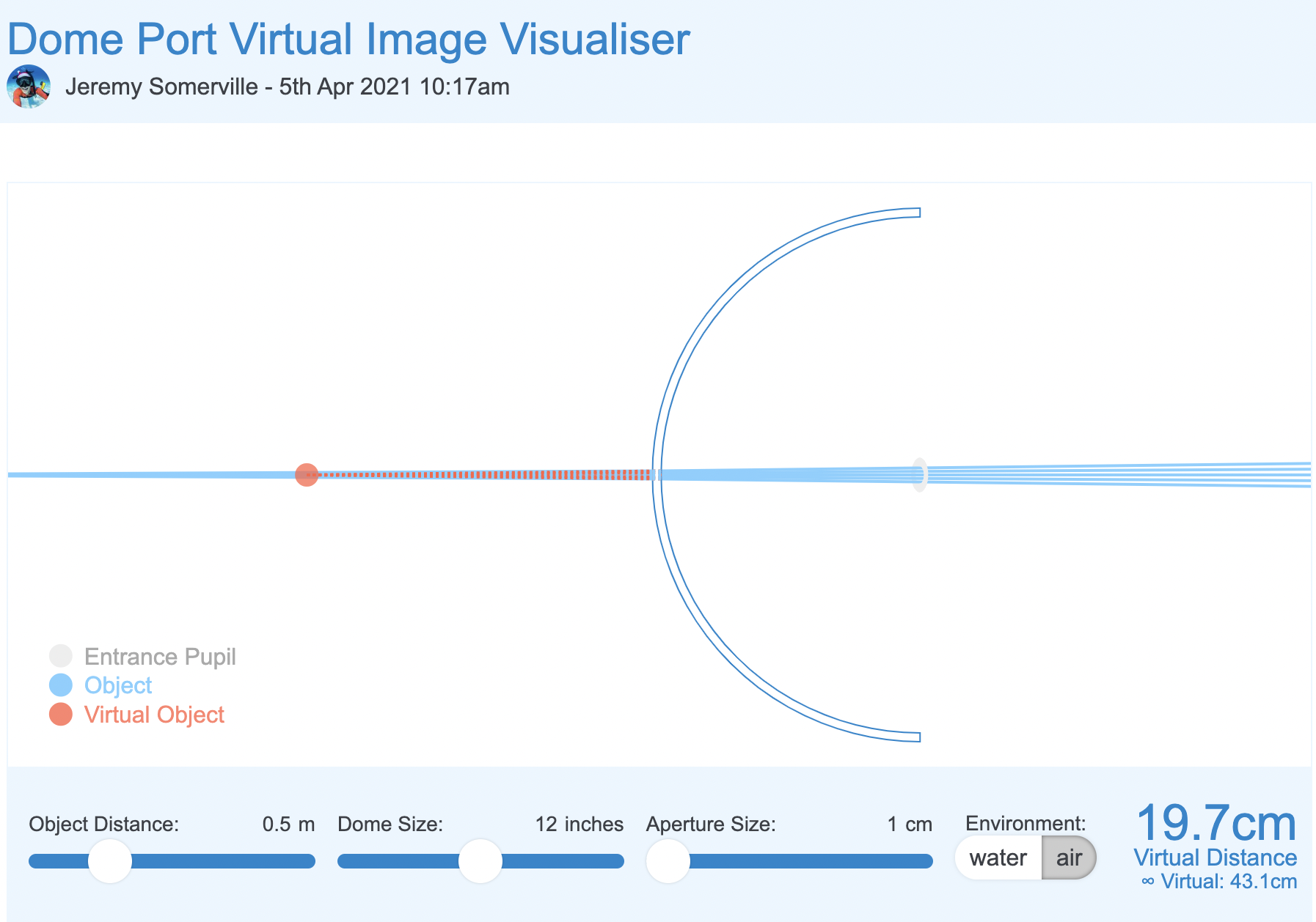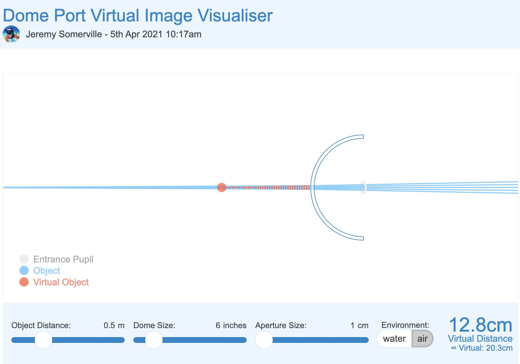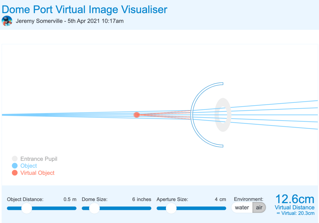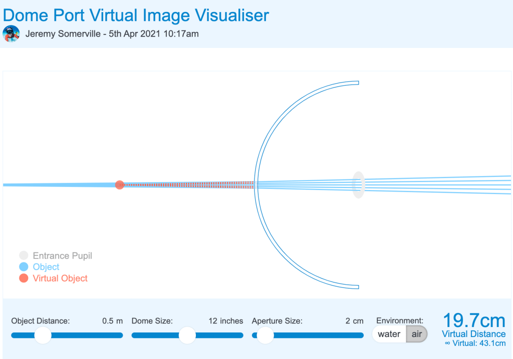 Using the dome port visualiser we can see that the effect of a dome is to bring the image closer to where it really is.