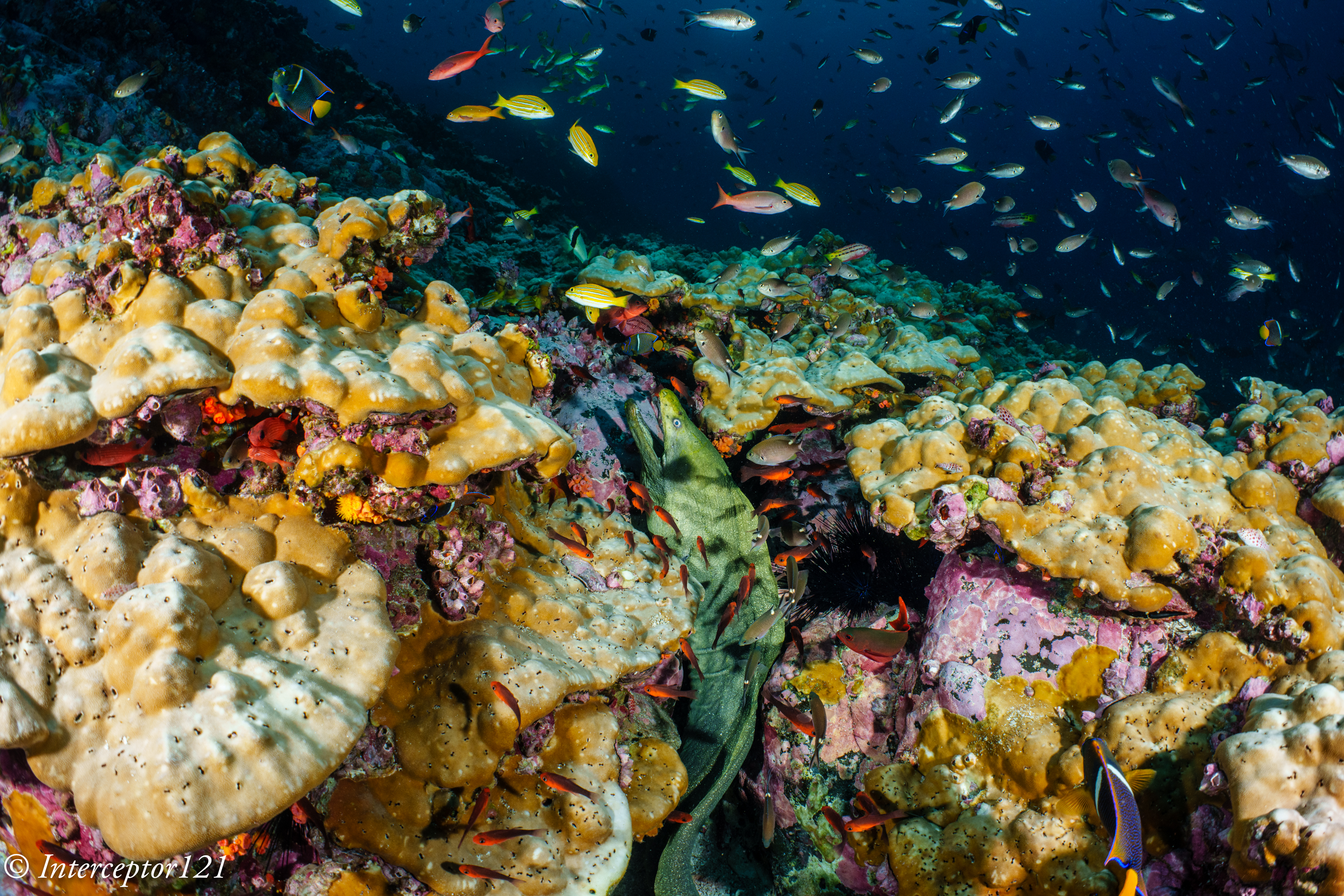 Although people go to Malpelo for sharks a special mention goes to the amount of (free swimming) giant morays. The population is huge and this fish is really a pleasure to watch and capture with your camera.