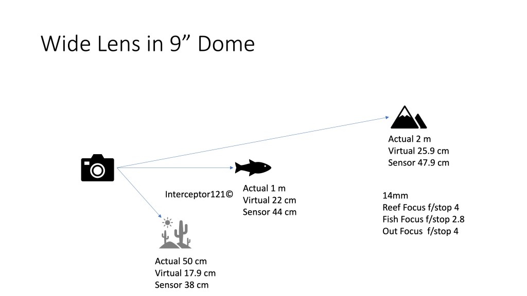 What does this mean and is it true? First, the majority of rectilinear lenses are unable to offer the same diagonal field or view of a wet lens combined with a longer optic so this comparison is a bit difficult. Second majority of dome ports on the markets are limited to 14mm widest focal length so a comparison to match the field of view is not entirely possible.