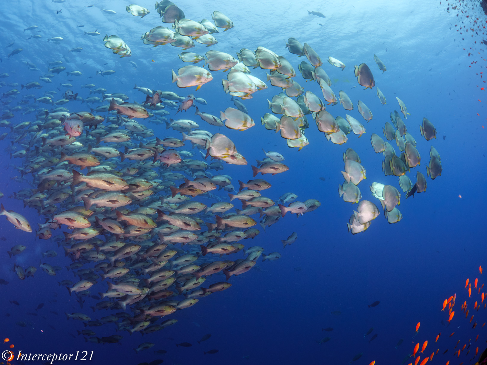 Two dives at Shark Reef the current was pumping. We missed the snappers on dive one but they were there in full force with the batfish on dive 2. The group however ran out of air very fast trying to get the shots. Last dive was at Ras Ghoslani to have a break and finally a session of split shot that was not very successful due to waves however I did produce a decent one with quite some fish.